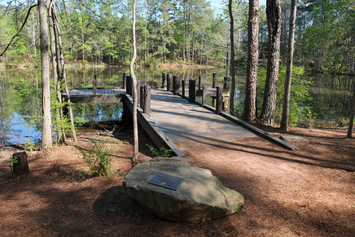 This popular Nature Area offers a mix of habitats – an upland hardwood forest, beautiful creekside granite outcroppings, and a rushing stream bordered by native azaleas. Visitors will enjoy a fishing dock on a small pond, a gazebo, and almost three miles of nature trails. Keep an eye out on the trails for a few historic sites!