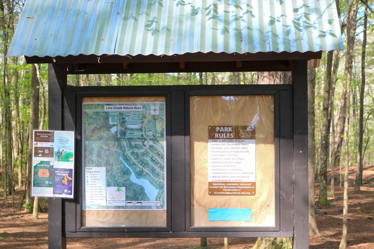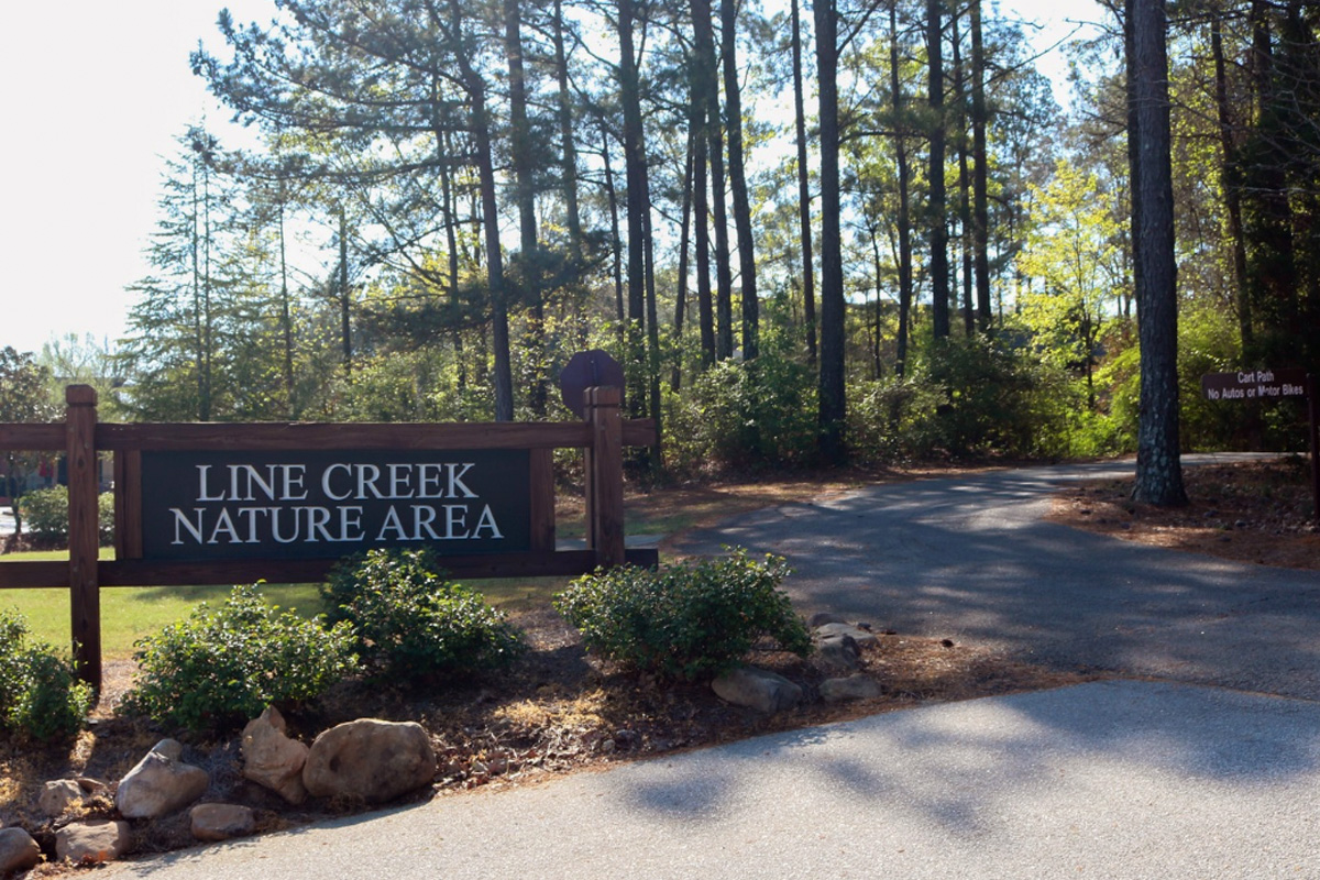 The entrance to Line Creek Nature Area is located on Line Creek Drive, Peachtree City, GA 30269. It is adjacent to the shopping center with TJ Maxx, Ulta, and Newk’s, off of GA-54.  The path connecting the existing path at the southern end of the Line Creek Nature Area parking lot to the new path at the northern entrance of the park was project #23 on the 2017 SPLOST.
