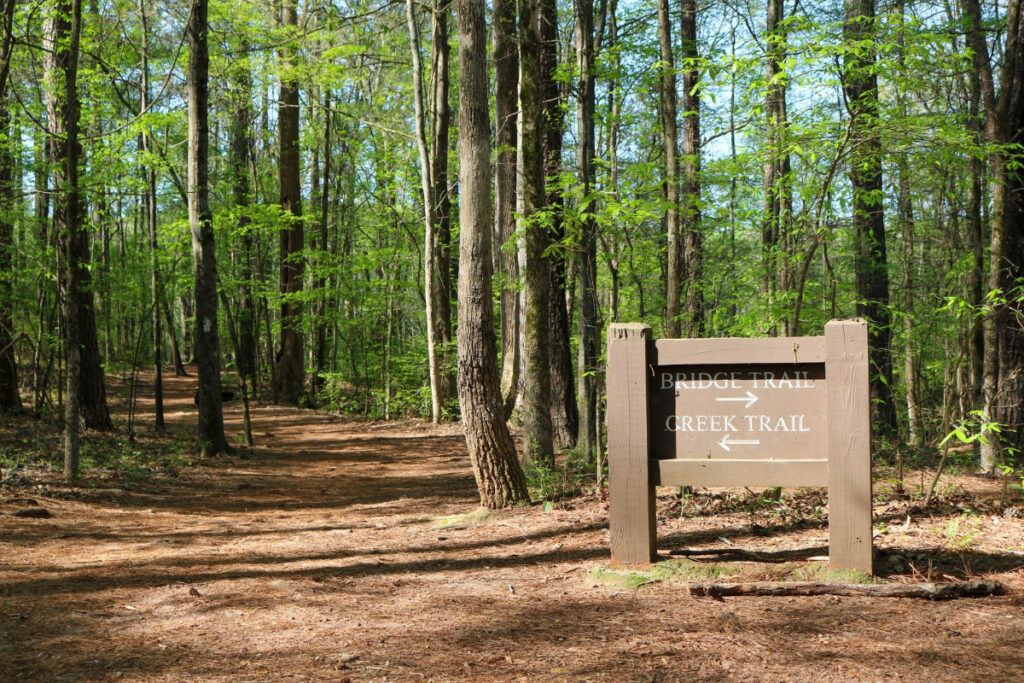 Line Creek Nature Area is a 70-acre public preserve along Line Creek off Highway 54 on the Fayette/Coweta County line. This stretch of Line Creek was home to multiple mills in the 1800s, and the remnants of their dams can still be seen today. When on the Mule Rock trail be sure to look for the Mule Rock carving! The nature area is furnished with picnic tables, small bridges, a rock amphitheater, and a few information kiosks.  In 2017, Trinity Development completed the new Line Creek Wetland with an observation deck. This area catches and detains stormwater runoff that slowly feeds the small pond and eventually Line Creek. It displays the characteristics of a wetland and demonstrates how water is naturally slowed down and filtered.